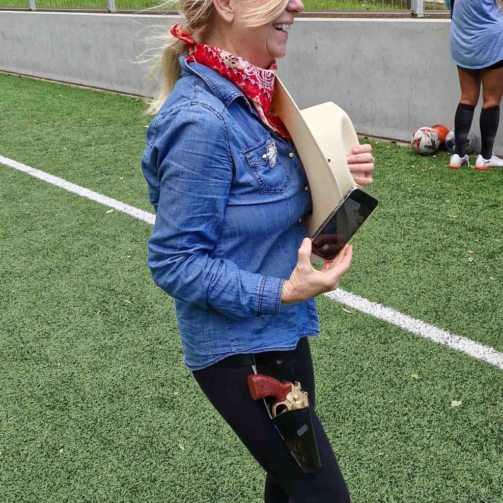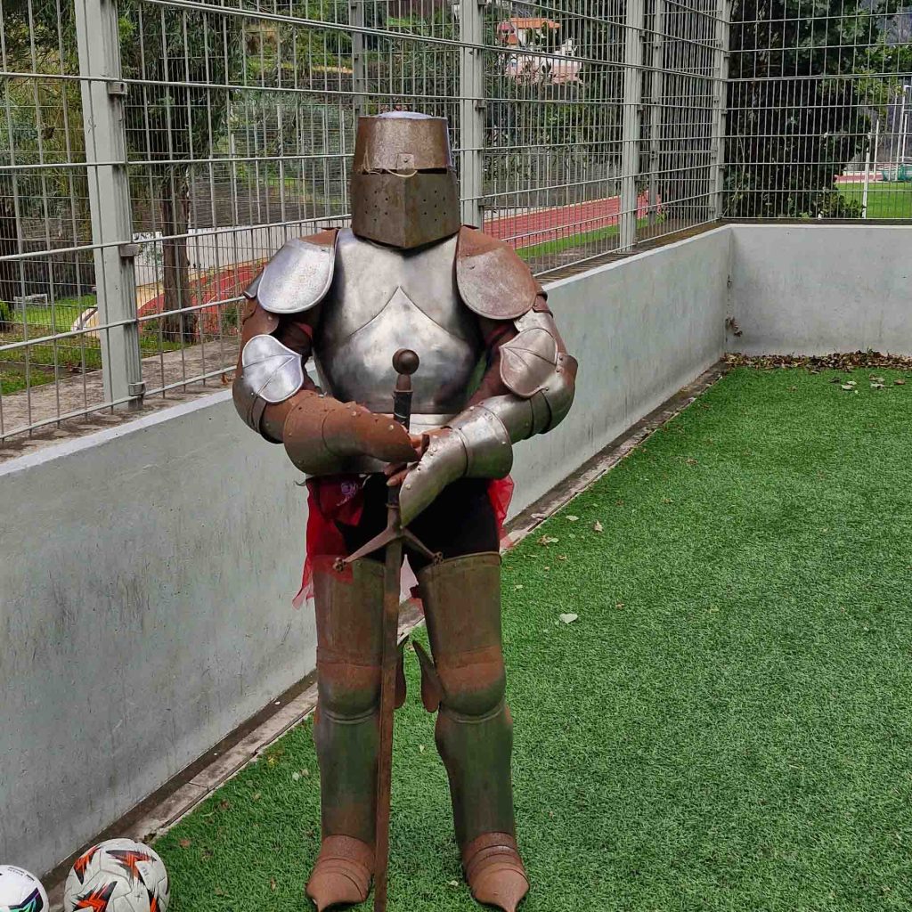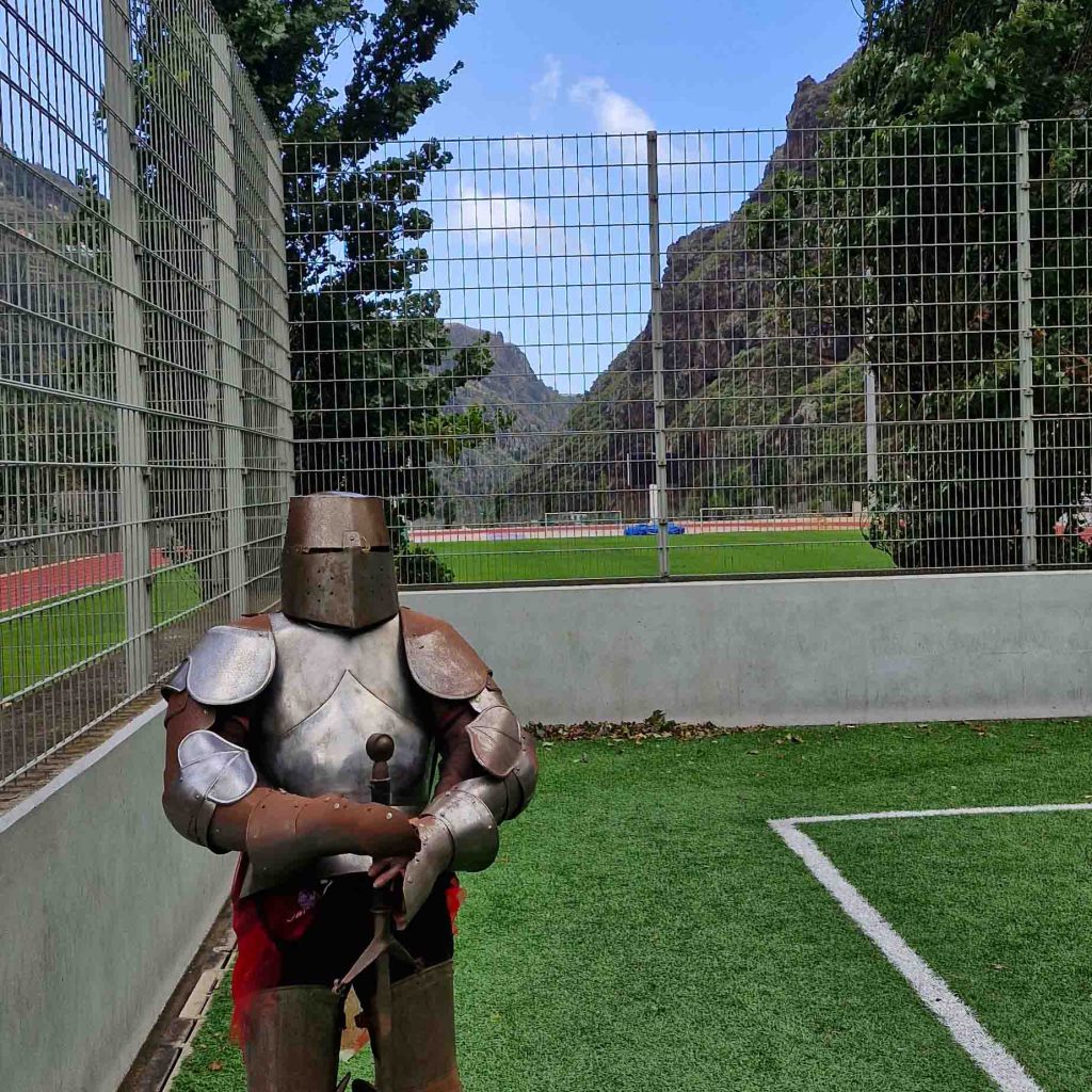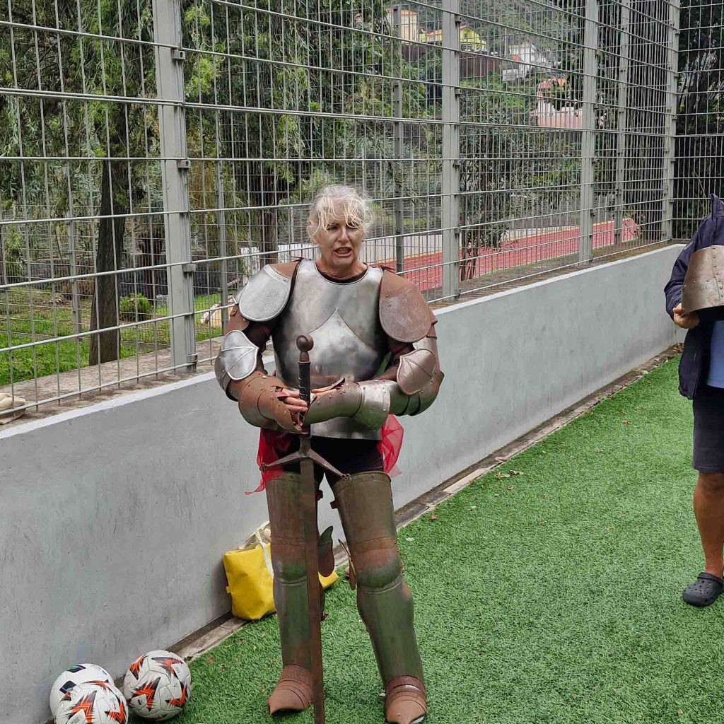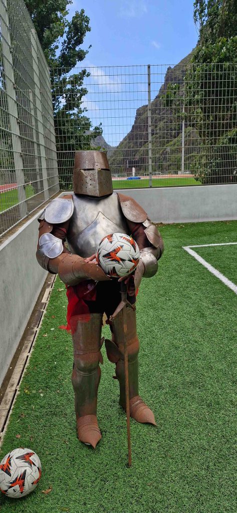 Forget Lancelot … Kate stole the show. She arrived at Centro Desportivo da Madeira in Ribeira Brava clad in full medieval plate armor: chainmail, helmet, gauntlets, the works. With every clank and jingle, it felt like a 14th‑century legend had stepped straight onto the pitch.